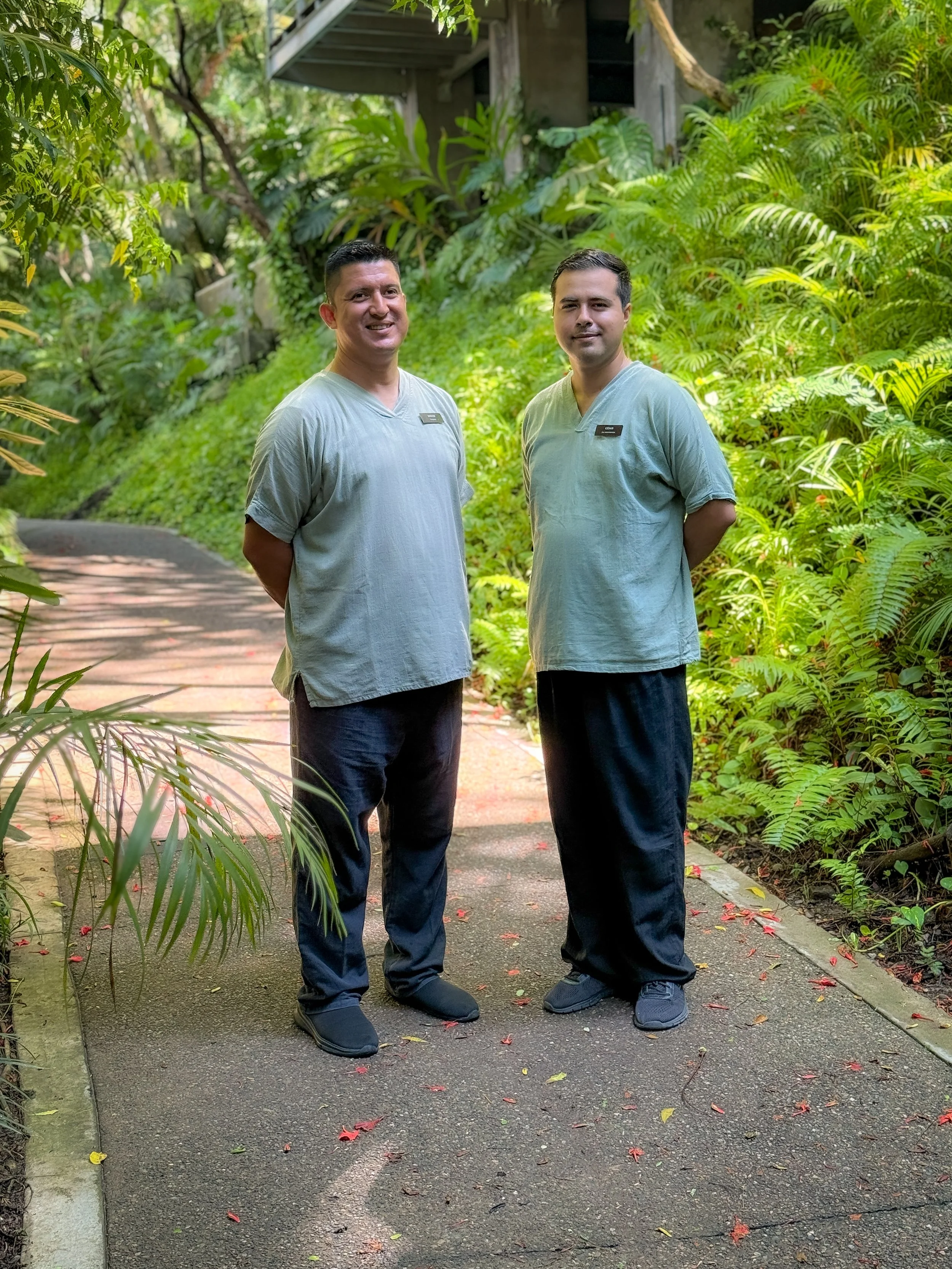 Junior (izquierda) y César fueron contratados principalmente por su calidez y atención al cliente, y ambos cuentan con licencia de conductores profesionales para transportar a nuestros huéspedes desde y hacia las actividades y el aeropuerto.